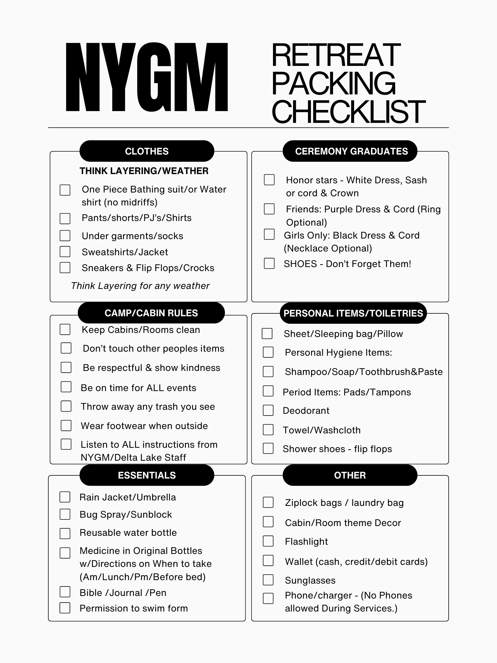 The purpose for a retreat just for girls- Sponsored by NYGM is to create a space for all girls, grades 3rd-12th (whether they are part of a Girls Min. club or not) to grow spiritually, mentally, and socially. By creating intentional moments for worship, diving into God's word, games, crafts, and breakouts, our prayer is that they are challenged in their relationship with God, build one another up, create friendships, and develop a heart for Discipleship, Mentorship, and Missions. God Sees, Loves, and Hears each one of them!